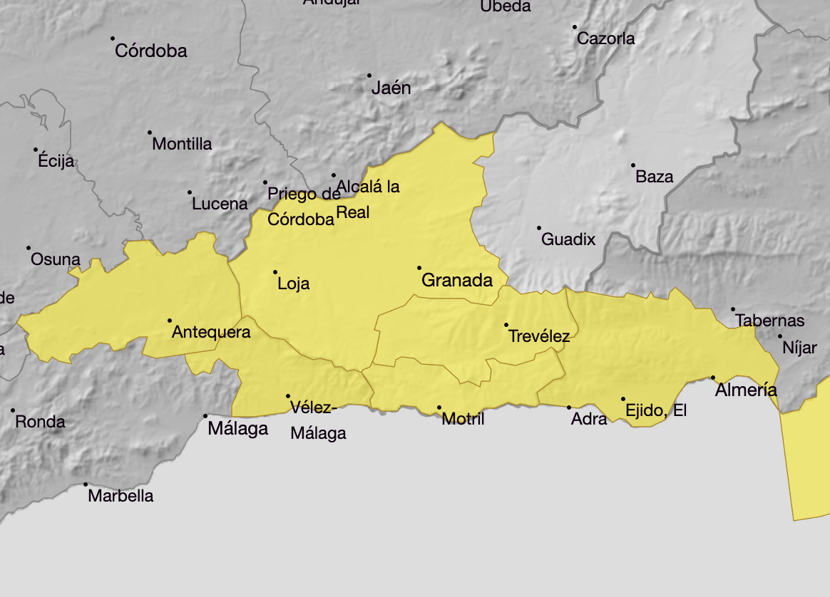 State weather agency Aemet has issued a yellow weather warning Friday in parts of Malaga, Granada and Almeria.