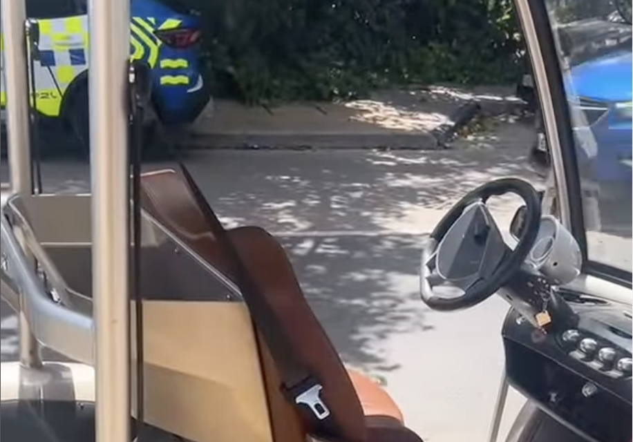 A police car can be seen pulled up next to a golf buggy, which the victim was allegedly riding at the time of the incident.