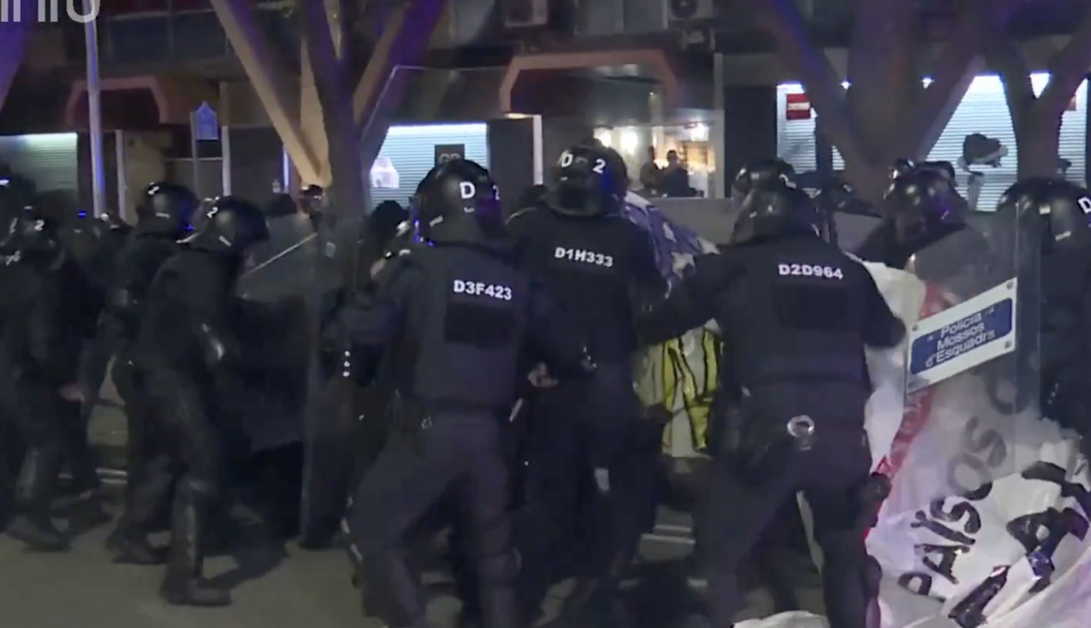 However, when they reached the area, Mossos d’Esquadra officers blocked access to the building. It was at this point that a group of masked individuals began throwing objects, including bottles and smoke canisters, at the police line.