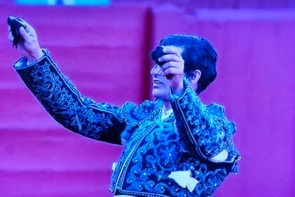 Moment bullfighter waves two severed ears to former king Juan Carlos in Sevilla as crowd roars