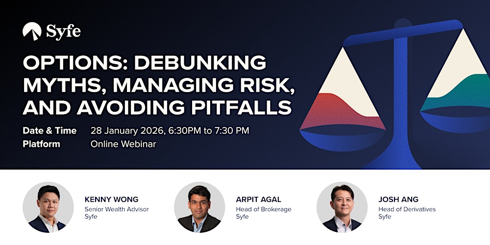 About SyfeSyfe is a digital investment platform offering Managed Portfolios, Brokerage services, and Cash Management solutions—designed to help individuals grow their wealth and build a better financial future.We’re here to empower everyone with the financial confidence to start investing and take control of their finances. Whether you’re a complete beginner or a seasoned investor, our free webinars and events offer practical insights into retirement planning, investing strategies, and money management—led by Syfe’s team of investment experts.-Note on Data CollectionBy registering for this event, you consent to Syfe collecting the personal data you provide in the registration form and contacting you regarding our products, services, and events. You can opt out at any time by clicking the “Unsubscribe” link in our emails.