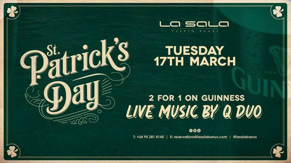 Únete a nosotros en La Sala el 17 de marzo para disfrutar de 2 por 1 en Guinness y ritmos en vivo de Q Duo. ¡Bebe, baila, canta y celebra como los irlandeses!